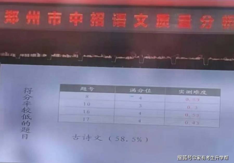 试题稳中求新,整体难度下降,其中整体得分率较低的题目是古诗文(58.5%);