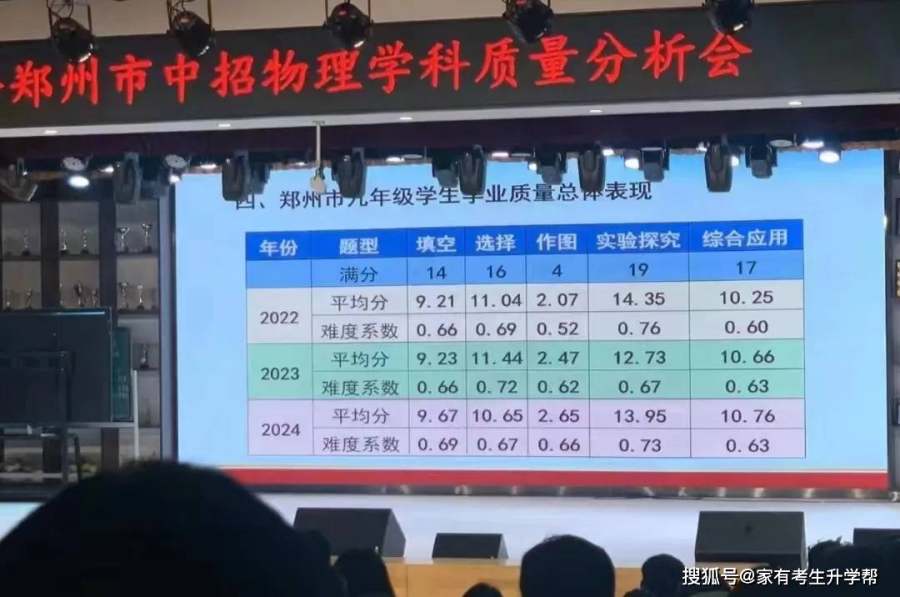 近日,2024年郑州市中招物理学科质量分析会举行。会上对近三年河南中考试题进行比较,并对各题满分值、平均分、难度、满分人数、零分人数做出统计。