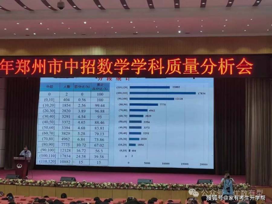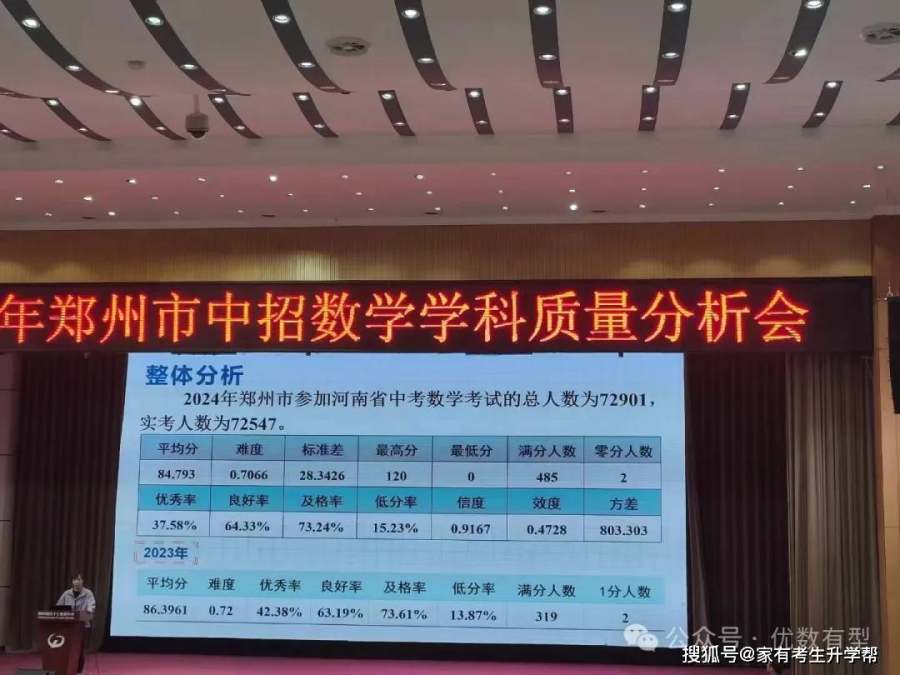 根据会议统计,2024年郑州市参加河南省中考数学考试的总人数为72901人,实考人数为72547人。其中满分人数为485人,110分以上考生人数为10882人。
