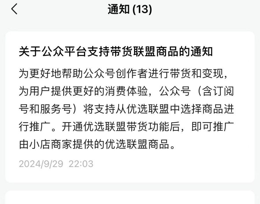 9月29日,微信再升级公众号功能,订阅号助手通知消息显示,微信公众号(包括订阅号和服务号)现在支持从优选联盟中选择商品进行带货推广。此次升级后,公众号无需绑定视频号即可开通优选联盟功能。