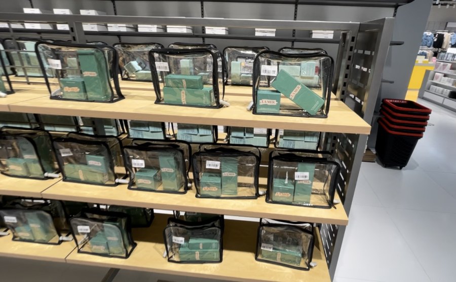 值得注意的是,在二楼左侧的美妆区域,大牌美妆单品多以礼袋打包的形式成列。例如一款海蓝之谜30ml的经典面霜需与150ml的精粹水打包售卖,售卖价2469。这两款单品在淘宝海蓝之谜官方旗舰店售价3330,但旗舰店会附送65ml洁面、30ml身体乳、3.5ml面霜、3ml毫升精华。