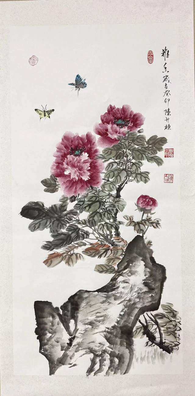 陈先生对牡丹花的色彩把握堪称精妙,用鲜艳而醇厚的颜色渲染出花瓣的娇艳欲滴,从粉嫩的浅红到浓郁的深红,过渡自然,仿佛能嗅到花香。牡丹花的叶子则以翠绿为主,墨色勾勒出的叶脉清晰可见,为花朵增添了一份生机与活力。