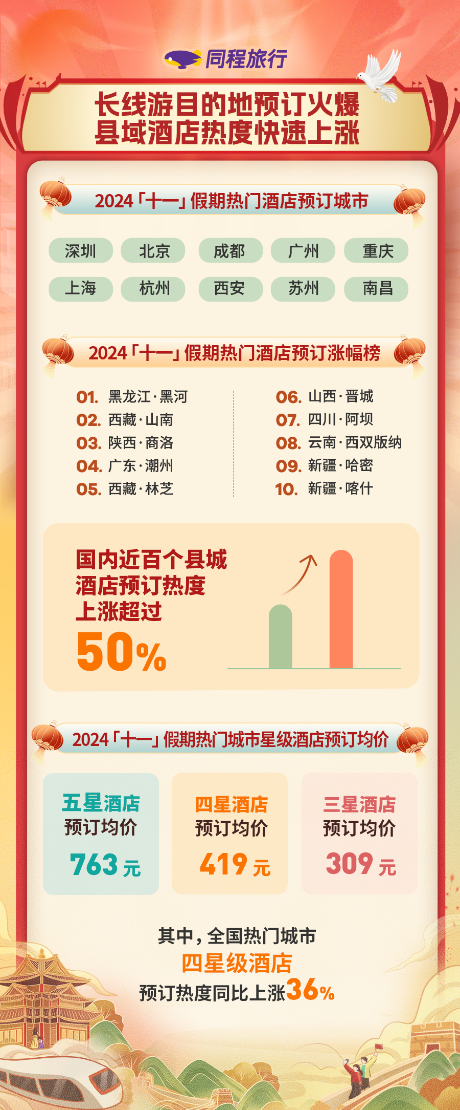 同程旅行数据显示,2024年“十一”假期国内各大热门县域目的地酒店预订增速超过大盘。其中,预订热度同比涨幅超过50%的县和县级市就有近百个。今年“十一”假期,中国游客出游过程中更注重性价比,在各星级酒店中,兼顾服务品质与性价比的四星级酒店预订热度涨幅最高,同比上涨36%。国内四星级酒店均价达到419元。在目的地选择上,深圳、北京、成都、广州、重庆、上海、杭州、西安、苏州、南昌是国内最热门的酒店预订城市。“十一”假期,不少亲子游客选择带娃去北京天安门广场看一场升旗仪式,也有更多游客更向往成都、西安、南昌等目的地的美食美景,完成了打卡梦想。东北和西部长线目的地,是城市居民长假出游的热门选择,黑龙江的黑河,西藏的山南、林芝,新疆的哈密和喀什,以及四川阿坝、云南西双版纳等长线游目的地进入酒店预订涨幅榜前十。受国产游戏《黑神话悟空》的持续带动,山西在整个十一假期的旅游消费表现不俗,其中,晋城酒店预订热度快速上涨,位列榜单第六。