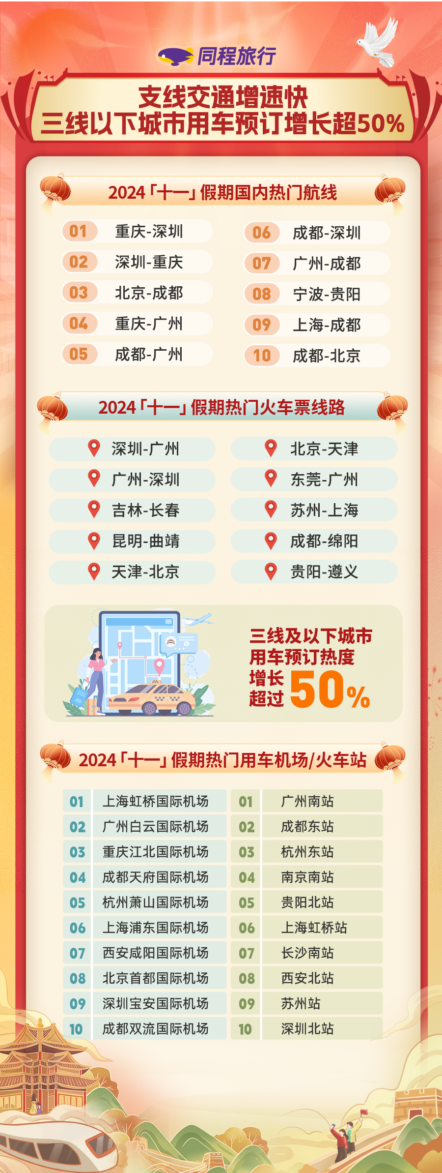 民航方面,2024“十一”假期成渝地区往返长三角、珠三角的航线较为热门,重庆-深圳、深圳-重庆、北京-成都、重庆-广州、成都-广州等航线预订热度较高。假期期间,不少非枢纽机场的航班预订量同比增长迅速,价格也有所上浮。10月1日和7日的高峰时段,不少核心城市前往支线机场的全价经济舱也“一票难求”。同程研究院分析认为,越来越多的城市居民在假期前往低线城市和小众旅游目的地,而这些航线短期供给增速低于需求增速,导致票价上涨和票量紧张。同程旅行和国内众多机场集团达成合作,提升机场数智化建设,增强“空空联运”和“空铁联运”服务能力,为用户出行提供便利。高铁出行方面,各大城市群内部城市之间,以及区域核心城市往返周边的火车线路预订较为热门。同程旅行数据显示,受到整体出游市场带动,东北的长春往返吉林,云南昆明往返曲靖,贵州贵阳往返遵义的火车线路进入热门榜单前十。用车方面,低线城市出行市场活跃度较高,同程旅行平台上三线及以下城市用车预订热度增长超过50%。上海虹桥机场、广州白云机场和重庆江北机场用车预订热度排名前三。用车预订排名较高的火车站主要有广州南站、成都东站、杭州东站等。