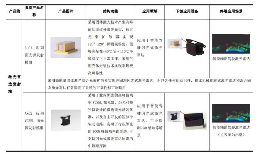 其中,炬光科技中游汽车应用模块主要包括激光雷达面光源发射模组、激光雷达线光源发射模组、激光雷达光源光学组件等。