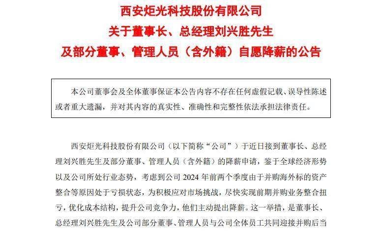 9月27日,炬光科技发布公告显示,公司于近日接到董事长、总经理刘兴胜及部分董事、管理人员(含外籍)的降薪申请。鉴于全球经济形势以及公司所处行业态势,考虑到公司2024年前两个季度由于并购海外标的资产整合等原因处于亏损状态,为积极应对市场挑战,尽快实现前期并购业务整合扭亏,优化成本结构,提升公司竞争力,他们主动提出降薪。