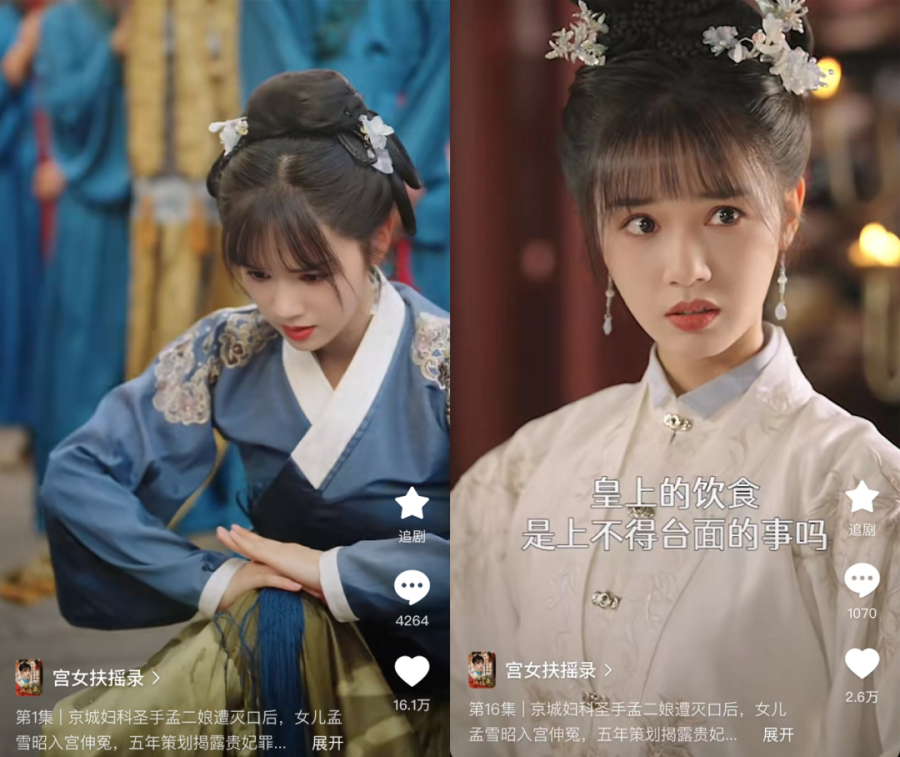 再看服化道、取景、拍摄节奏、布光等方面,不少爆款短剧做得像电视剧一样精致。有的还采用一些镜头语言来做隐喻,比如《宫女扶摇录》中,女主角设计让嬷嬷抢走自己的水晶步摇后,镜头从木桌边缘下方的方孔穿过,对女主角面容特写,暗喻她当时“夹缝求存”的处境。