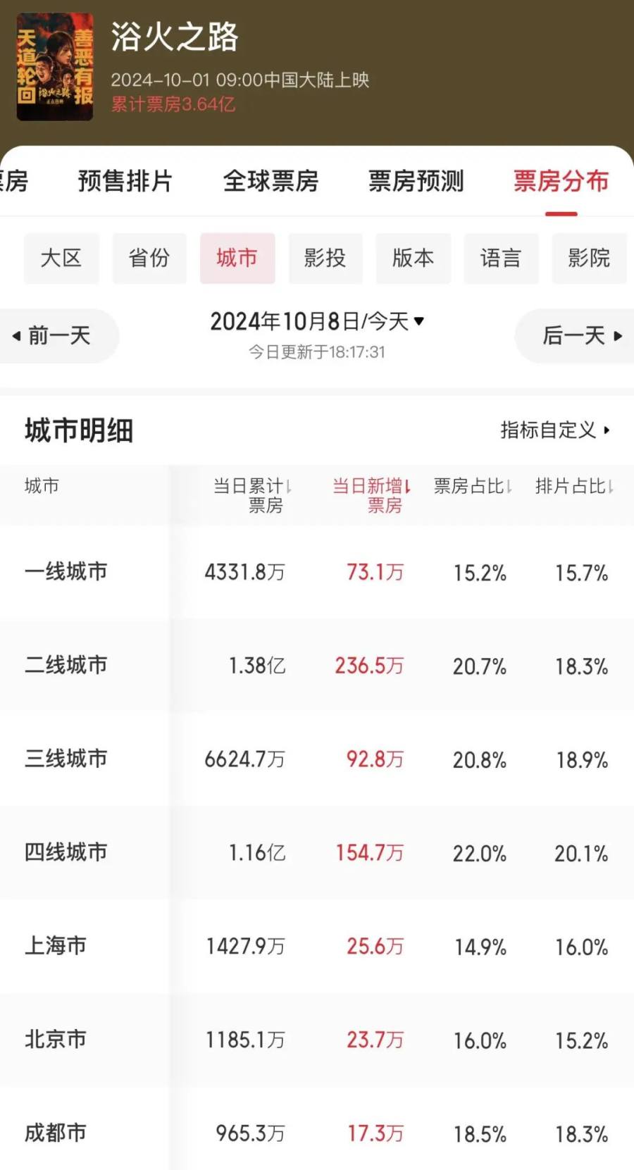《浴火之路》自上映以来,一二三线城市的票房占比高达60%,总票房为3亿;四线城市占比20%,为1.1亿。其中北京、上海、成都、武汉是主力票仓区。《祝你幸福!》上映半月时,北京上海西安三地的票房占比排到了前三。一二三线城市的票房总计3800万,远高于四线城市的1800万。更明显的则是《误杀2》的盘型,上映15天时,一二三线的城市票房占比为12.8%,为8.4亿;四线城市为3.4,票房2.7亿,上海北京成都仍是大头。