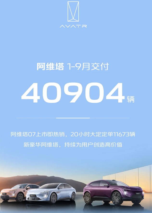 作为第一个完整交付的自然年,2023年全年阿维塔交付新车总量2.96万辆,而今年前9个月其累计总销量达到40904辆。尤其是阿维塔07新车发布后,9月其销量继续同比大增了47%。