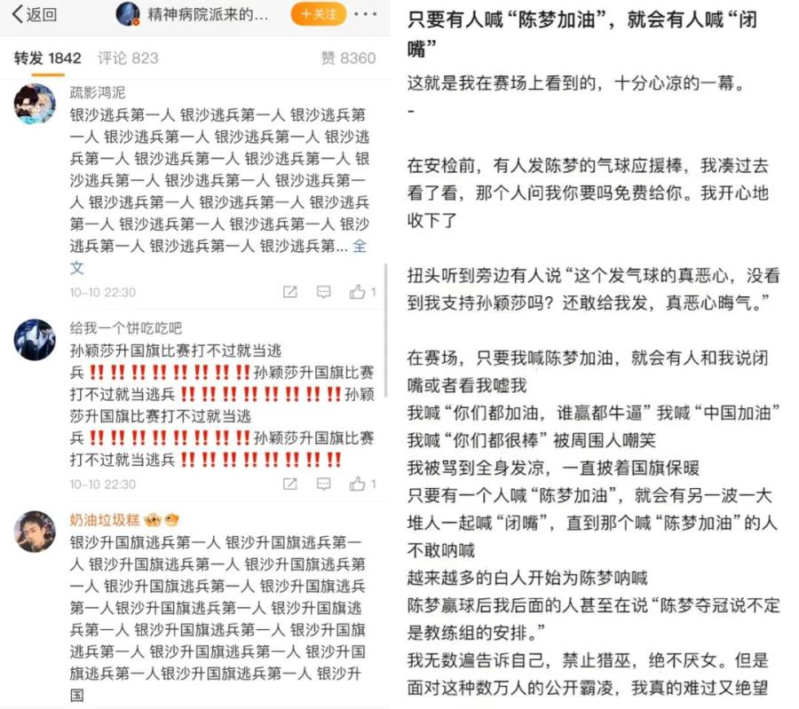 赛后,针对乒乓球女单决赛讨论中出现的拉踩引战、恶意攻击等行为,微博清理了12000余条违规内容,另有300多个账号被阶段性或永久性禁言。还有网民因发表诋毁运动员言论而被刑事拘留。
