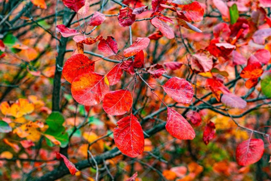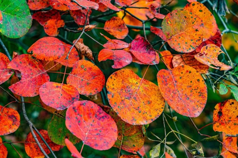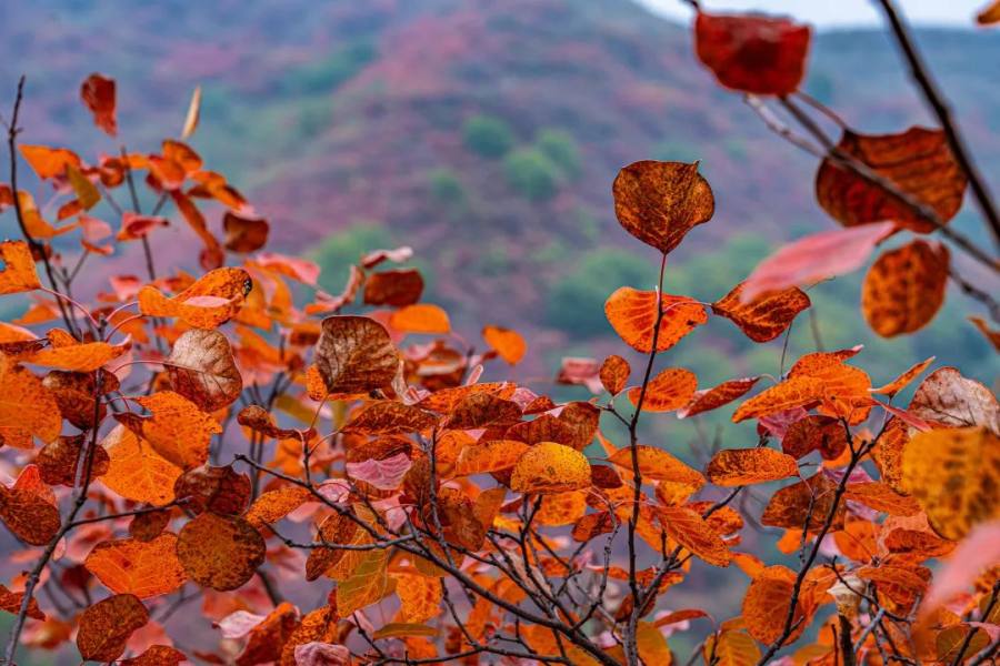 禹州的红叶树主要是漆树科的黄栌,到了深秋,叶子变得色彩鲜艳。有桃红、紫红、嫣红、猩红、绛红、鲜红等多种颜色,片片红叶如天边的彩霞,深深浅浅,层层叠叠,把群山装扮得分外妖娆。