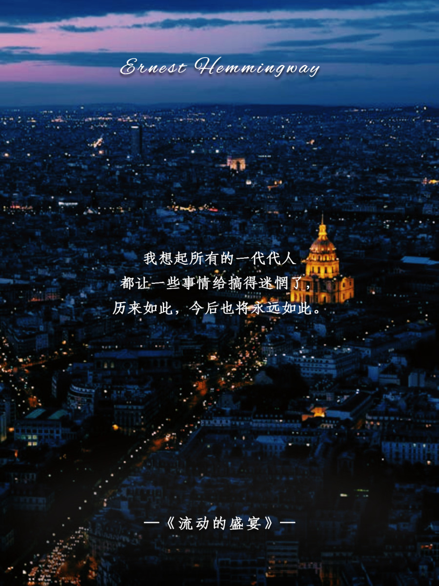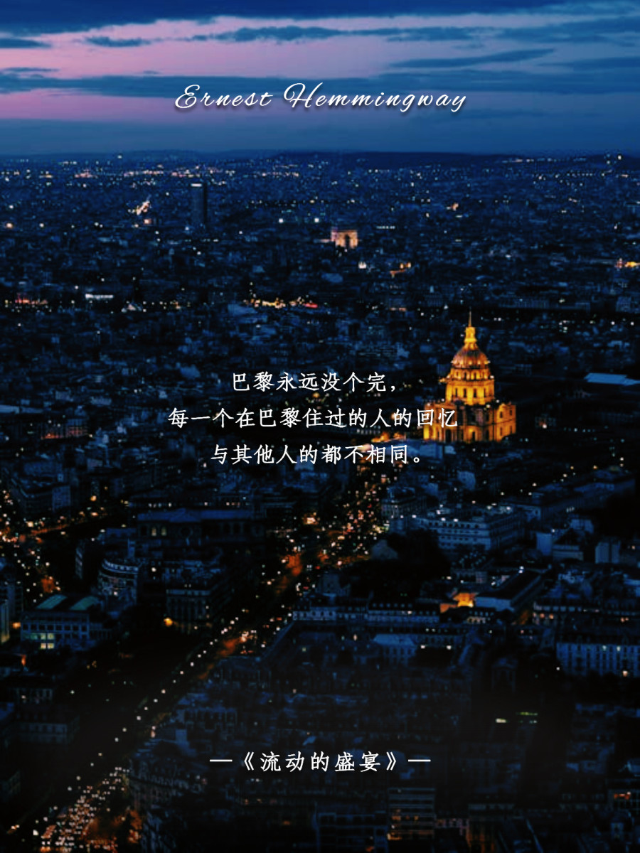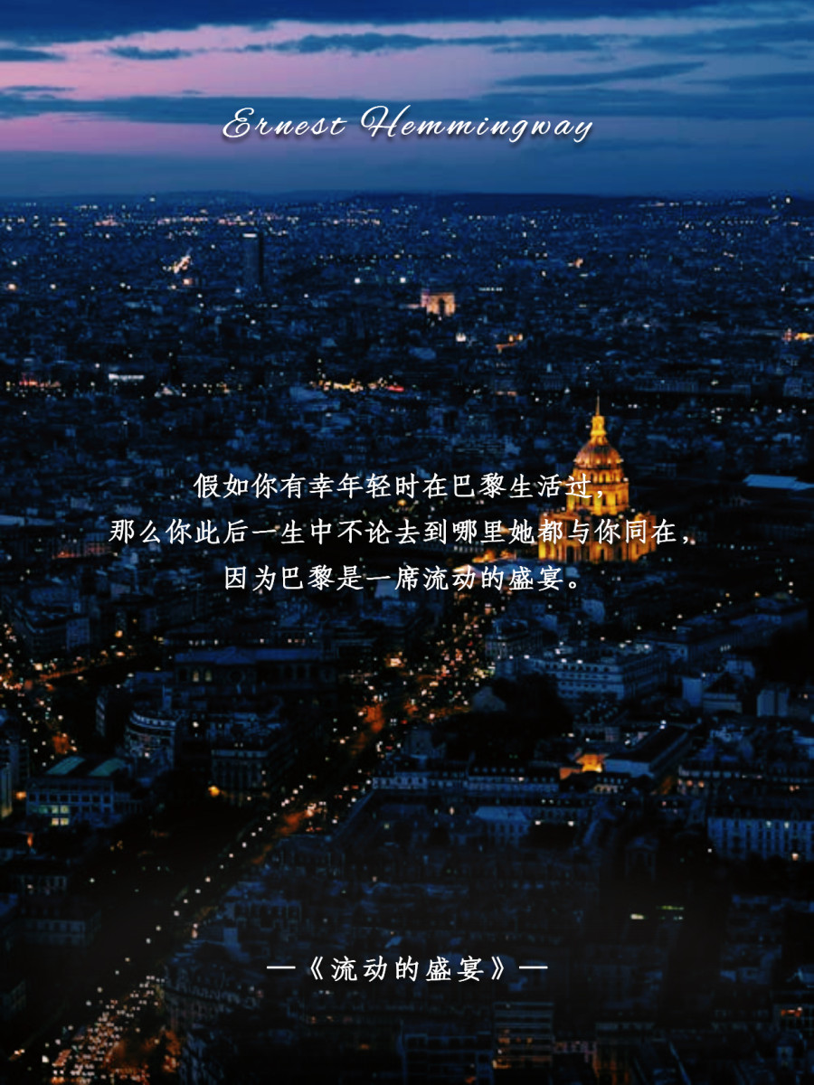 假如你有幸年轻时在巴黎生活过,那么你此后一生中不论去到哪里,她都与你同在,因为巴黎是一席流动的盛宴。