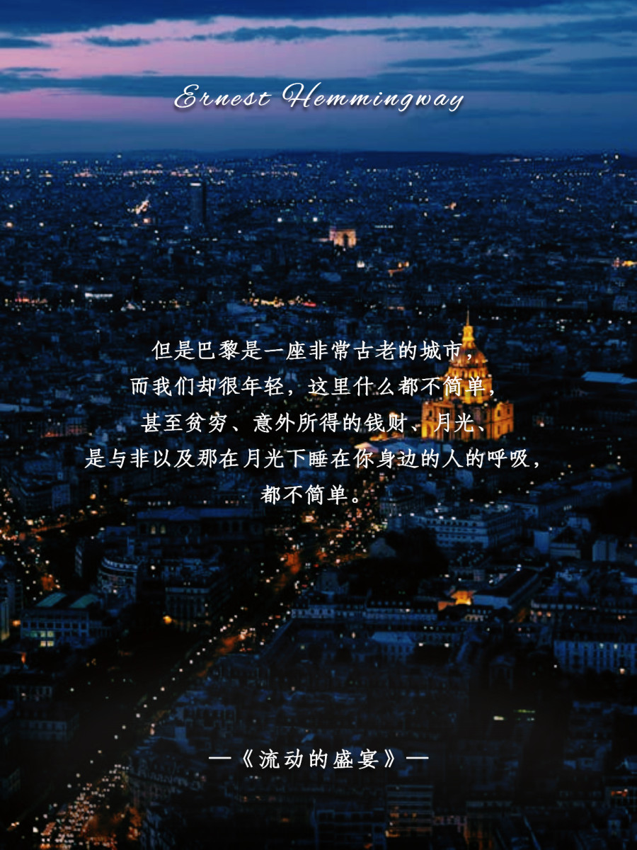 但是巴黎是一座非常古老的城市,而我们却很年轻,这里什么都不简单,甚至贫穷、意外所得的钱财、月光、是与非以及那在月光下睡在你身边的人的呼吸,都不简单。