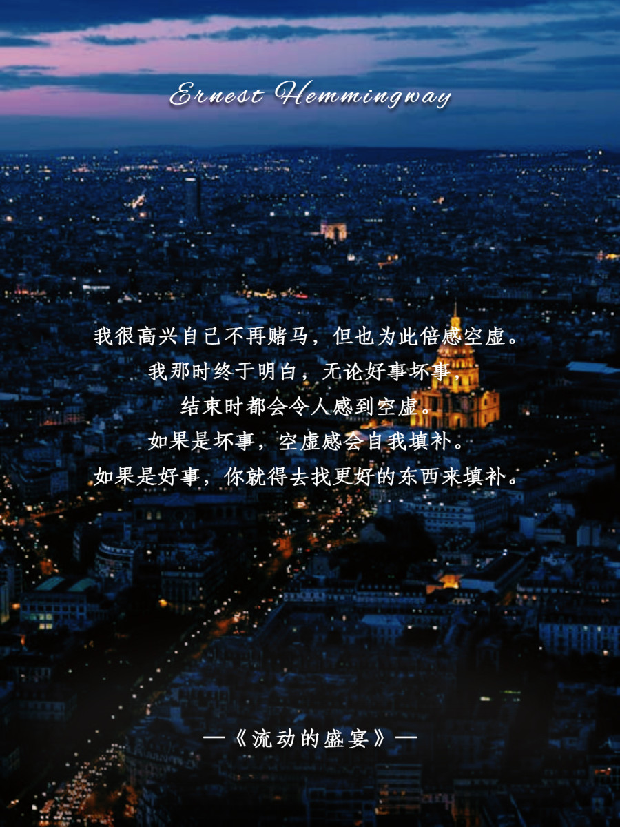我很高兴自己不再赌马,但也为此倍感空虚。我那时终于明白,无论好事坏事,结束时都会令人感到空虚。如果是坏事,空虚感会自我填补。如果是好事,你就得去找更好的东西来填补。