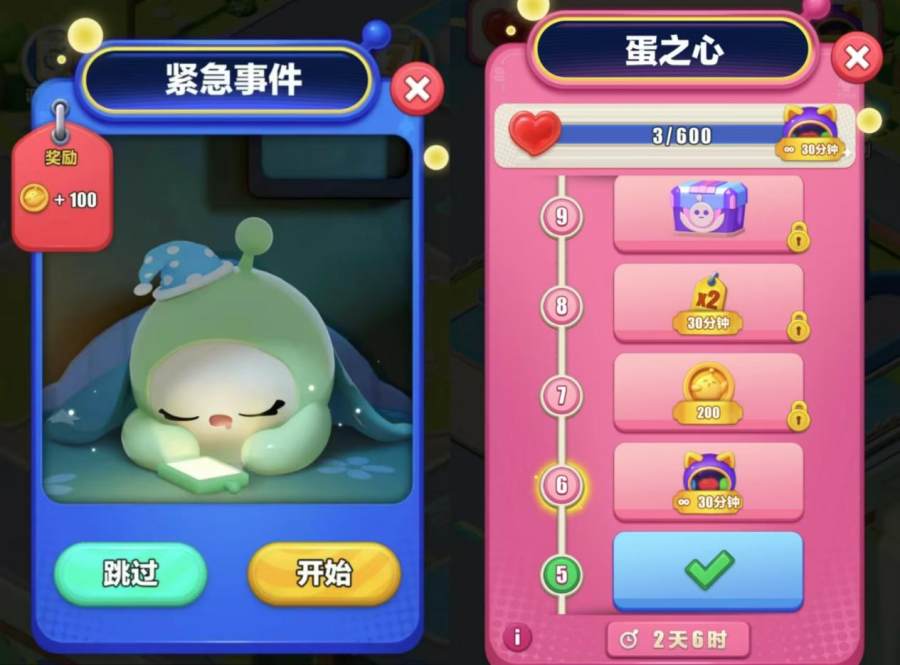 一个是在1分钟内通过关卡,解救困在噩梦中的蛋仔的“紧急事件”,另一个是获取游戏资源的奖励关卡“限时时间”。