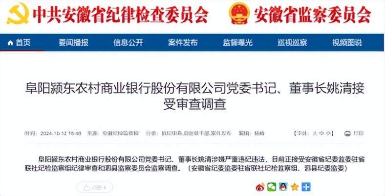 2024年10月12日,安徽纪检监察网发布一则通告,内容显示阜阳颍东农村商业银行股份有限公司党委书记、董事长姚清涉嫌严重违纪违法,正接受安徽省纪委监委驻省联社纪检监察组纪律审查和泗县监察委员会监察调查。