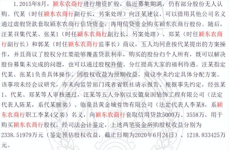 值得一提的是,汪侠一案的判决书中提到,2015年8月,颍东农商行进行增资扩股,临近募集期满,仍有部分股份无人认购。代某向汪某建议,可以借用其他公司名义通过虚假贷款套取颖东农商行信贷资金,再用信贷资金购买颖东农商行股份。