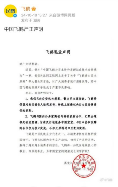 10月18日,黑龙江飞鹤乳业有限公司通过官方渠道发表声明称,近日,互联网上出现了关于“飞鹤进口日本原料”等大量失实言论,这些言论不仅误导了消费者,还对飞鹤的品牌声誉造成了严重不良影响。飞鹤已经向公安机关报案,警方已经立案侦查。