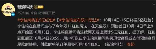 图:李佳琦将发5亿红包的媒体报道。来源:新浪科技微博