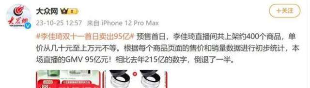 据多家媒体报道,2023年双十一首日,李佳琦直播间销售额为95亿元,和2022年同期相比,减少一半以上,创下过去3年新低;而今年618,李佳琦直播间预售同比又下降了46%。