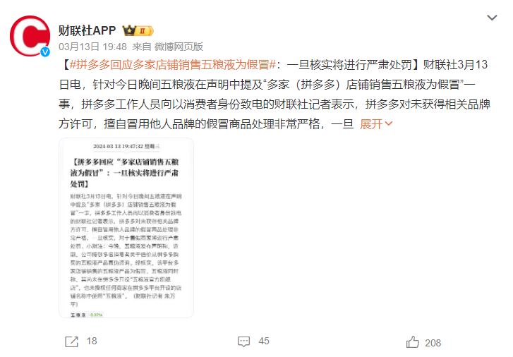 10月18日,剑南春发布了一封《致剑南春消费者的告知书》。告知书中表明,剑南春近来收到了多位消费者的反馈,称对在电商平台补贴购买的52度水晶剑南春(550ML、558ML)存疑。而剑南春调查后发现,这些消费者所提供店铺的剑南春授权书均系伪造。经过对各电商平台补贴的多个店铺销售的水晶剑南春采样、核查,剑南春初步认定,采样的水晶剑南春来源复杂,疑似为回收拼凑销售。
