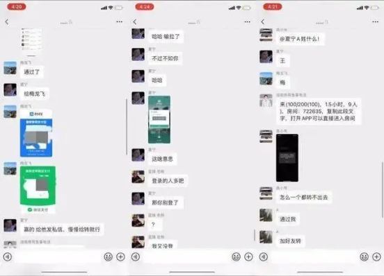 这些主播使用一款名为WePoker的软件进行赌博,组织者在app内开好房间,然后将房间链接发布到微信群里吸引参与者进入。聊天群内夏宁、浩南等主播不断呼吁群友进房间开赌。