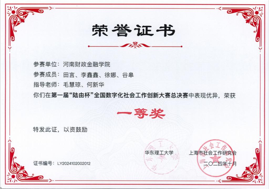 本届大赛由华东理工大学、上海市社会工作研究会主办,上海高校智库社会工作与社会政策研究院协办,旨在推动社会工作领域的数字化创新发展。大赛历时5个月,分为初赛和决赛两大阶段,吸引了来自全国29个省市、自治区的210支队伍共800多人参赛。河南财政金融学院安排法学院毛慧琼、何新华担任指导老师,代表队的四位选手在比赛过程中沉着应战、奋力拼搏,面对众多实力强劲的对手,展示出了扎实的专业知识、丰富的实务经验、灵活的应变能力和良好的团队协作,最终在众多参赛队伍中脱颖而出,斩获一等奖。