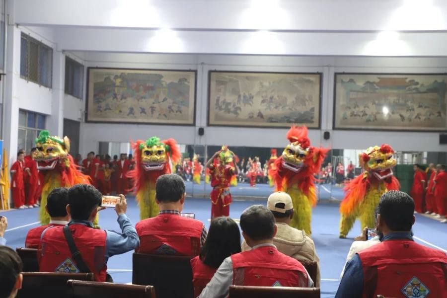 随后,考察团一行走进训练房观看武术展演。舞龙舞狮、刀枪剑棍、各路拳法纷纷亮相,尽显中国武术的博大精深和无限魅力。他们被鹅坡学子的精湛技艺深深吸引,发出阵阵惊叹和掌声。