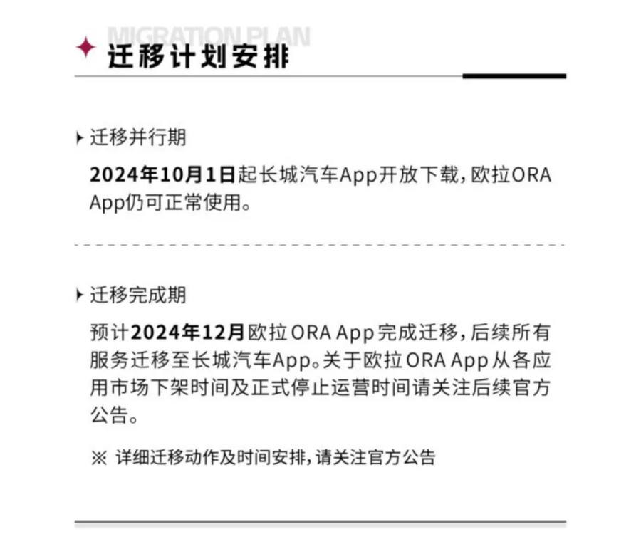 近日,欧拉发布了一则APP迁移公告,公告显示,欧拉ORA APP将在2024年12月正式停止运营,服务将迁移至长城汽车APP中,届时欧拉ORA APP将无法下载和使用。