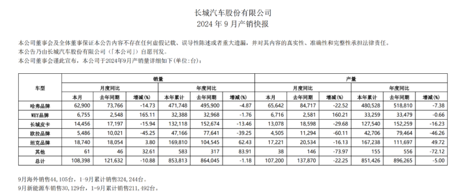 长城汽车2024年9月产销快报,图源上海证券交易所官网