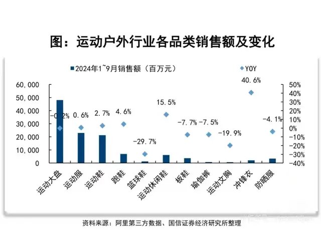 2023年被称为“冲锋衣元年”,2024持续升温,从2023年8月至2024年9月,魔镜数据显示冲锋衣在主流电商平台销售额突破100亿元。另据国信证券研报,运动户外所有品类中冲锋衣的增长断崖领先,超过40%。瑜伽裤下滑,防晒服显颓势,最防风的冲锋衣,正在被时尚之风劲吹。