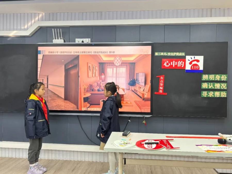 中原区伏牛路第四小学王甜老师执教三年级上册《心中的“110”》。王老师巧妙设计了“成长训练基地”闯关活动,分为“提高警惕”、“防范诈骗”和“智慧求助”三个环节。学生们在活动中积极参与,通过表演和讨论,不仅学到了保护自己的小技巧,还懂得了怎么在危险时刻保护自己。这堂课孩子们在玩中学,提高了自身的安全意识。