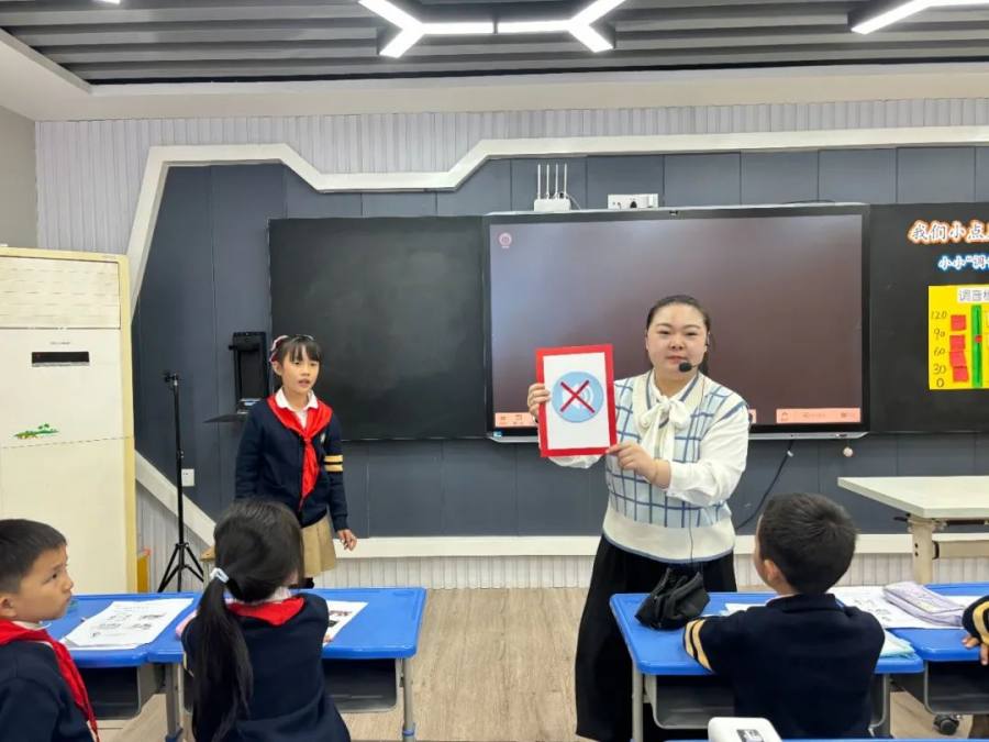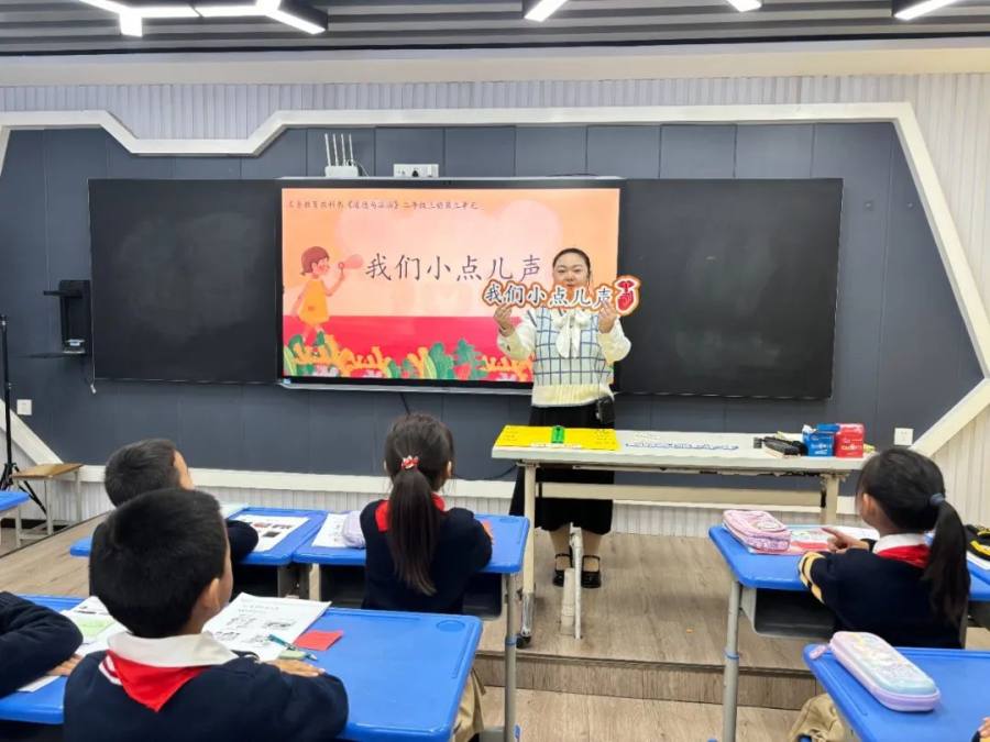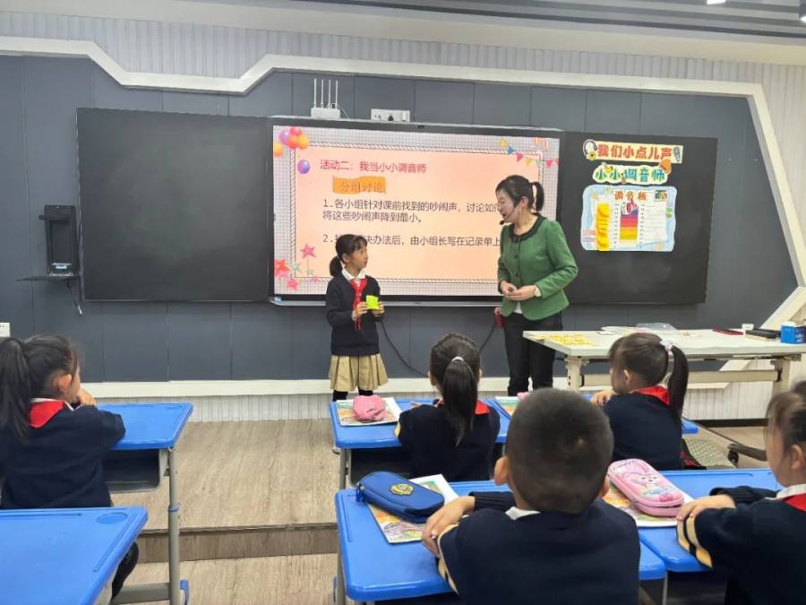中原区淮河路小学彭燕老师执教二年级上册《我们小点儿声》。课堂彭老师构建了“校园广播电台”的情境,学生们通过三个环节——“课前小调查”、“我是小小调音师”和“我是小小设计师”进行合作学习。在彭老师的引导下,学生们热情参与,积极讨论,整个课堂氛围既活跃又充满学习的热情。通过实践活动,学生们不仅学会了在不同场合控制音量的重要性,还增强了团队合作和创新设计的能力。
