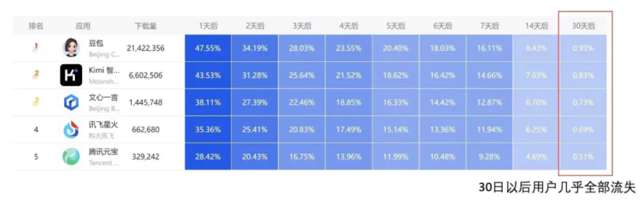 要知道,根据之前一张盛传的统计图表,国产 AI 大模型用户在30 日后,往往流失严重,从字节的豆包,到百度的文心一言(现在改名文小言),30日后使用率就都低于 1%。