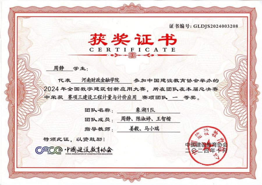 近日,由中国建设教育协会主办的2024年全国数字建筑创新应用大赛决赛成绩揭晓,河南财政金融学院代表队在全国总决赛中荣获建设工程计量与计价应用赛项一等奖。