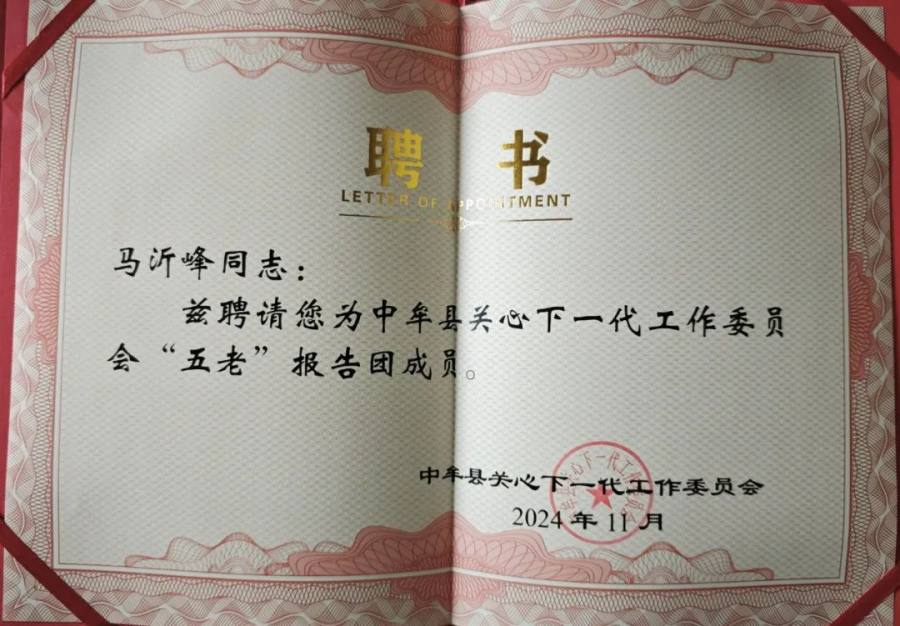 与会领导为受聘的“五老”报告团成员颁发聘书并亲切握手,表达了对他们过去贡献的肯定和获聘“五老”报告团成员的祝贺。