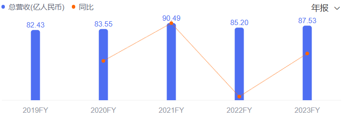 拉长时间可知,孩子王已在业绩下滑的泥潭中挣扎了近三年。2021年上市当年,该公司的总收入便由的90.49亿元降低5.84%至2022年的85.20亿元,2023年则略微回升至87.53亿元,增幅为2.73%,但仍未回到巅峰水平。