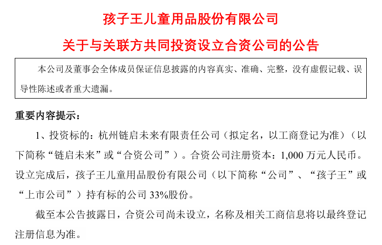 10月8日,孩子王又对外宣称将与广东辛选控股有限公司(下称“辛选控股”)合作,二者共同投资设立杭州链启未来有限责任公司(下称“链企未来”)。公告显示,链启未来的注册资本为1000万元,孩子王将持有其33%的股份。