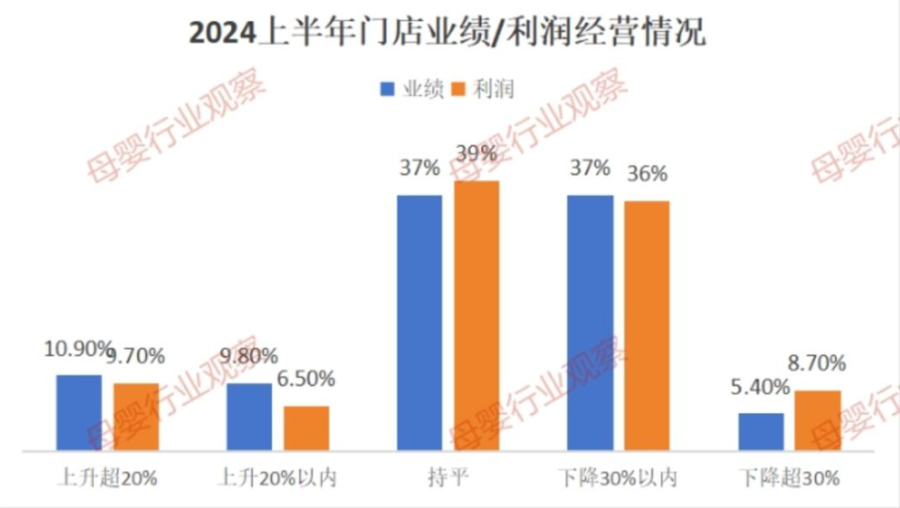 根据母婴行业观察发布的《2024上半年线下母婴渠道调研报告》,2024上半年有近五成的母婴店表示门店业绩、利润双下滑,其中下滑幅度在30%以内的门店占比近四成;仅有不到两成的母婴店表示门店业绩、利润处于上升态势。