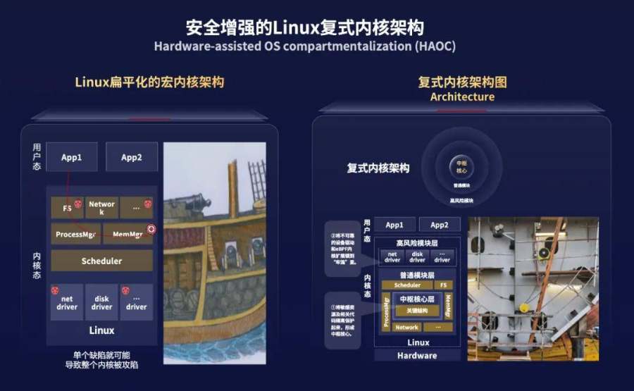 中关村实验室研究员、中国科学院计算技术研究所研究员武成岗,在操作系统大会2024上的主题演讲中打了一个形象比喻:“扁平化的宏内核架构像古代的战舰一样,攻击者很容易完成攻击,而复式内核更像现在的航母,里面有很多舱,有了舱以后,想实施攻击就变得很难。”