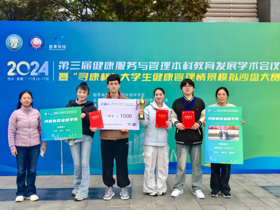 11月16日至17日,由中国老年医学会指导,中国老年医学学会院校教育分会主办、成都医学院承办的第三届健康服务与管理本科教育发展学术会议暨“寻康杯”大学生健康管理情景模拟沙盘大赛在成都医学院成功举办。由体健学院2022级健康服务与管理专业王佳乾、祝鲜庆、谢海燕三名学生组成的“体健康行”团队在大赛中顺利夺得一等奖。这也是继第二届“寻康杯”大学生健康管理情景模拟沙盘大赛后,河南财政金融学院再获此项殊荣。