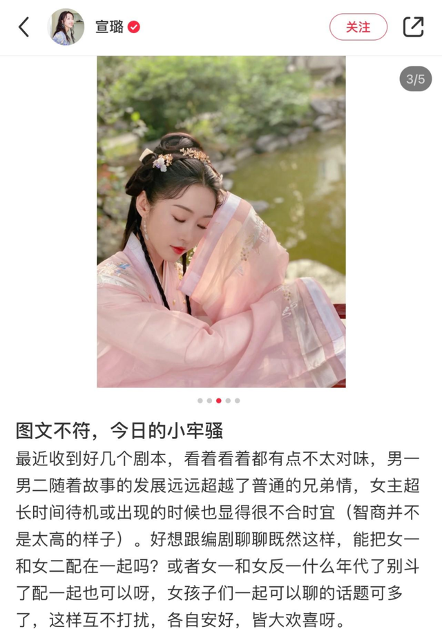 出演过爆款耽改剧《陈情令》的女演员宣璐曾在社交平台发表过想法,因为前几年耽改剧的发展过速,不少女演员只能选择成为其中工具人女性角色,给出了“男生拍双男主,女生拍双女主”的小建议。