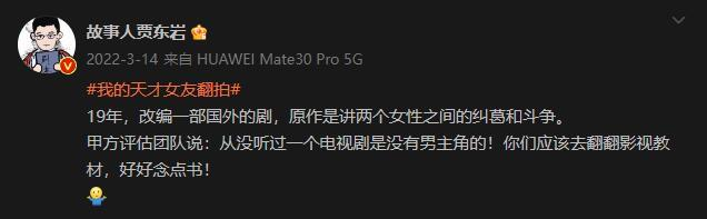 但女演员想要单纯地拍女性剧也很困难,编剧贾东岩曾在社交平台透露,改编国外双女主项目时被甲方质疑为什么没有男主,小娱也曾做过相关调查(点击蓝字查看文章),有文学策划提及对标双男主剧的双女主项目被否,理由是“两个女的怎么能和两个男的一样?”
