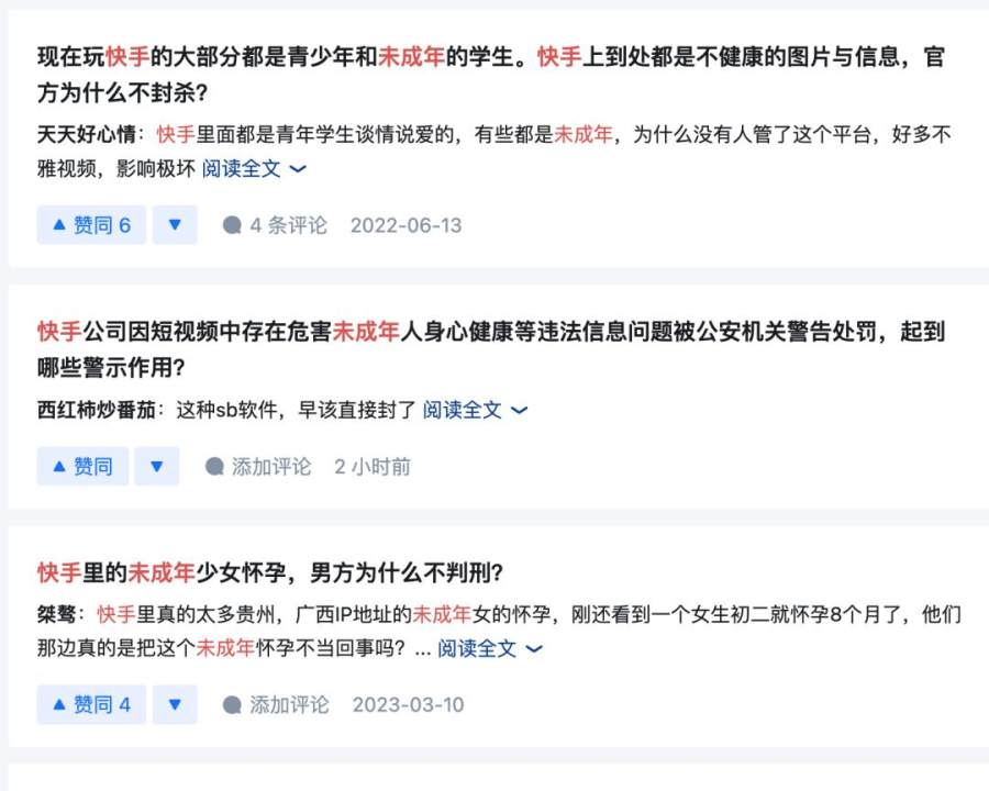 雷达财经注意到,尽管快手多次表态宣称积极保护未成年身心健康”,且多次发布“未成年人保护报告” ,但在知乎等社交平台上,围绕快手低俗内容对未成年伤害的话题一直出现。