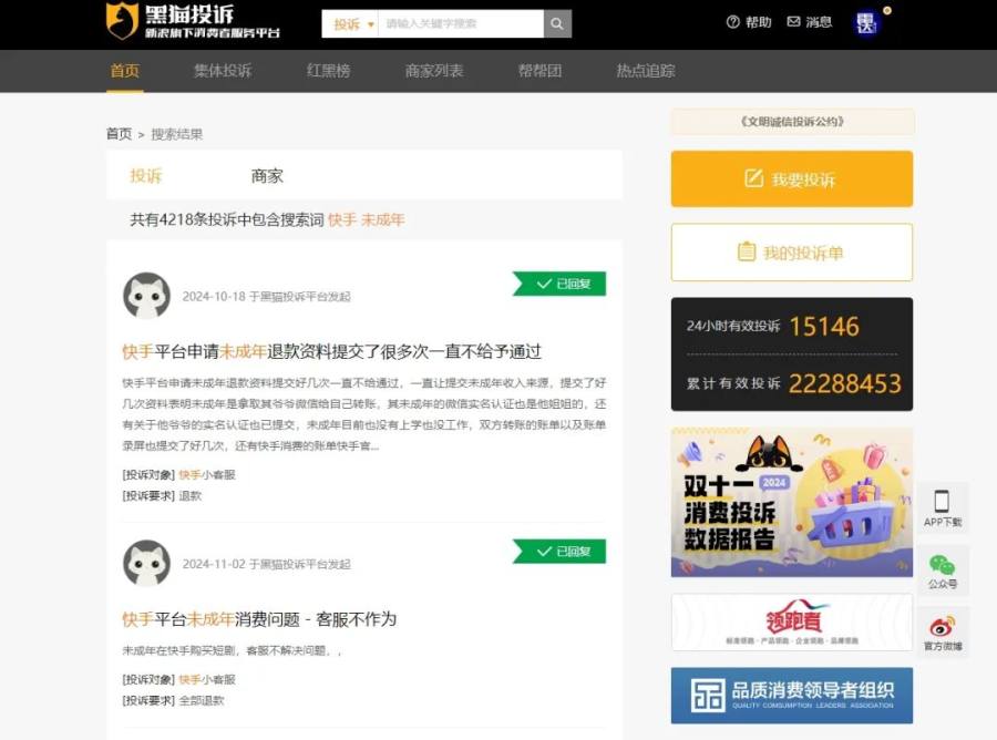11月24日,雷达财经在黑猫投诉平台上以“快手 未成年”作为关键字搜索,共出现了4218条投诉内容,其中绝大多数涉及未成年人消费退款诉求,包含“未成年人购买游戏产品无法退款”“未成年直播间被主播诱导打赏无法退款”“诱导未成年人在快手商城下单未退款”等。