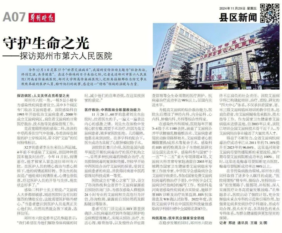 今年12月1日是第37个“世界艾滋病日”,我国的宣传活动主题为“社会共治,终结艾滋,共享健康”。在这个特殊的日子来临之际,记者走进郑州市第六人民医院(河南省传染病医院、郑州大学附属传染病医院),近距离接触那些为防艾事业默默奉献的医护人员,聆听他们的故事,感受这一“特殊”领域的温暖与力量。