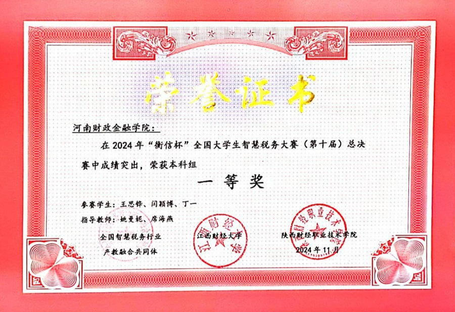 11月23日—24日,由中国税务学会、教育部《中国税制》课程虚拟教研室、江西省税务学会指导,全国智慧税务行业产教融合共同体、江西财经大学、陕西财经职业技术学院主办,浙江衡信教育科技有限公司技术支持的2024年衡信杯全国大学生智慧税务大赛(第十届)总决赛在江西财经大学举行。河南财政金融学院代表队取得自参加该项赛事以来的最好成绩,荣获大赛一等奖和二等奖。