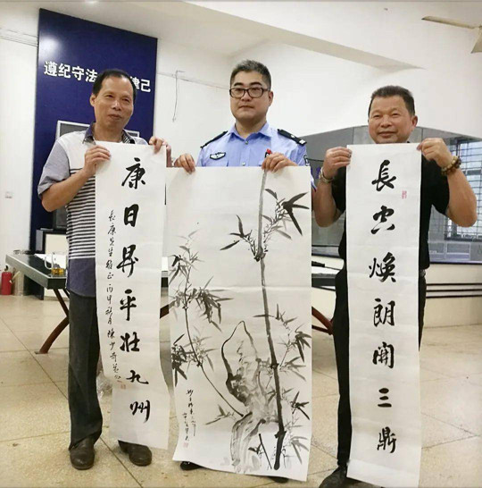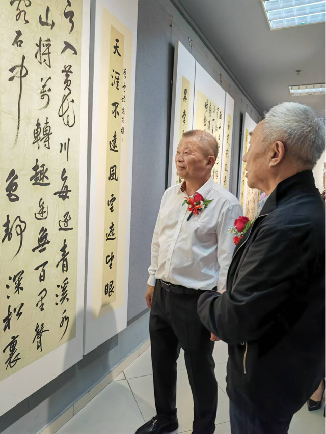 此外,他积极参与各类公益活动,如送文化送春联进军营、进街道、进村居等,将文化的种子播撒到社会的每一个角落。作为温州周边寺院的常客,他还为寺院题写殿名或书写门联,以佛教文化智慧劝导世人行善积德。