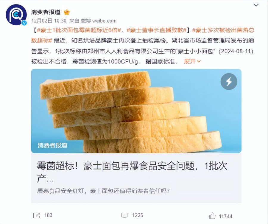 霉菌超标,让知名烘焙品牌豪士多次登上热搜。“豪士1批次面包霉菌超标近6倍”、“豪士涉事面包仍正常售卖”的话题在网上引发热议,12月3日,“豪士面包老板哭了”的话题更是冲上热搜第一。