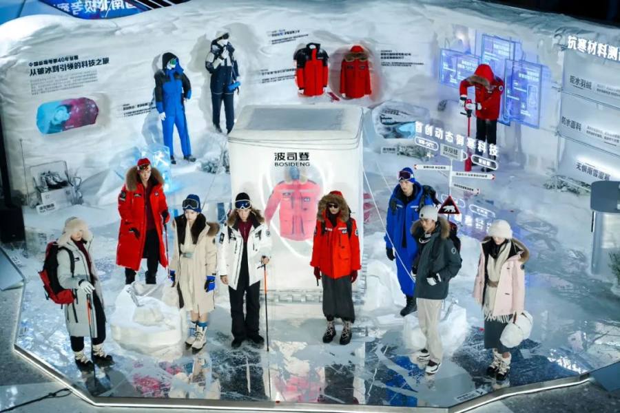 像波司登极地极寒系列使用了世纪之布 GORE-TEX;高梵全新风壳4.0鹅绒的面料搭载“户外拒风暴科技”;鸭鸭的“冰壳”系列在面料上也实现透气透湿抗暴雨。